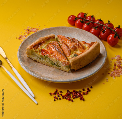 Quiche, salmon pie, broccoli, cheese. Quiche tart with fish and vegetables, cheese