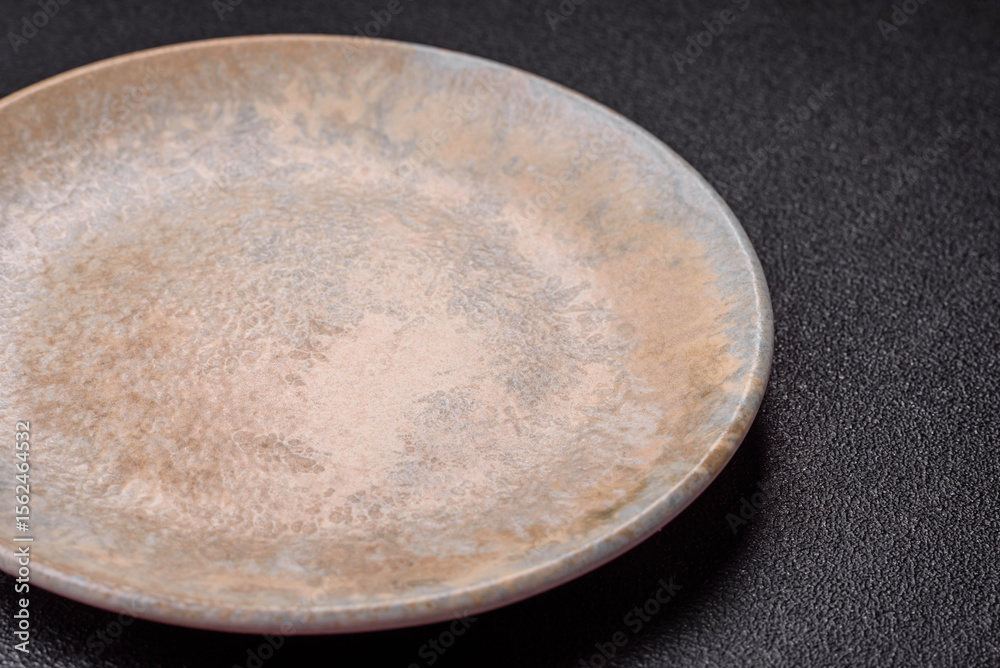 Empty round black plate for food, kitchen utensils on dining table. Empty plate