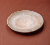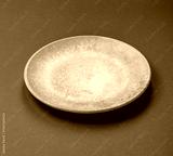 Empty round black plate for food, kitchen utensils on dining table. Empty plate
