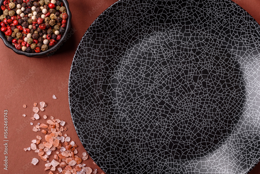 Empty round black plate for food, kitchen utensils on dining table. Empty plate