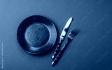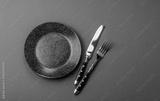 Empty round black plate for food, kitchen utensils on dining table. Empty plate