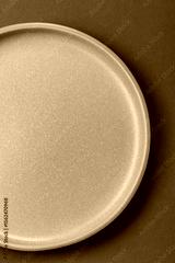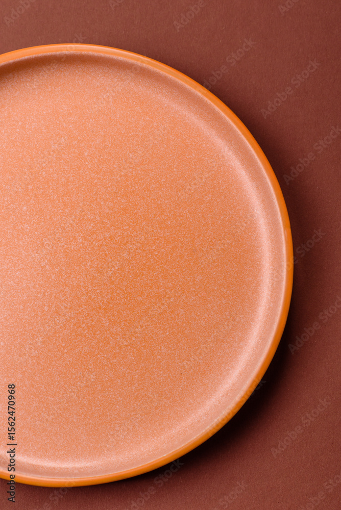 Empty round black plate for food, kitchen utensils on dining table. Empty plate
