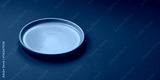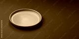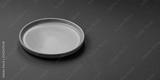 Empty round black plate for food, kitchen utensils on dining table. Empty plate
