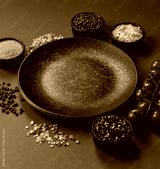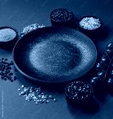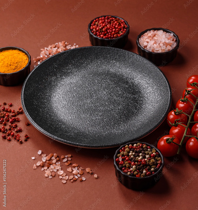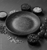 Empty round black plate for food, kitchen utensils on dining table. Empty plate