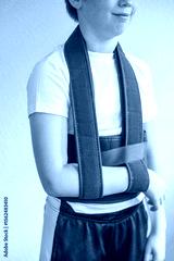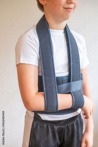 young man wearing therapeutic, Orthopedic arm sling to support injured limb, shoulder bandage, post-surgery support, medical care, healthcare, Medical device for immobilization