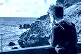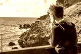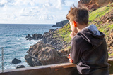 teenager traveler, boy 10-12 years old gazing ocean from high trail, wilderness mountain coast adventure, looking at sea and mountains, wilderness journey, travel moment