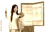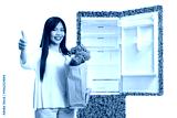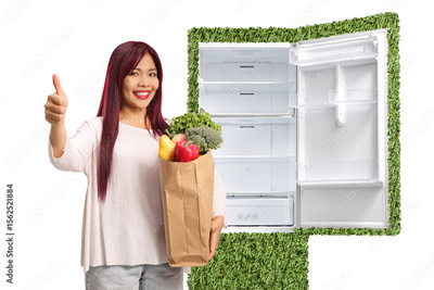 Asian woman with a grocery bag gesturing thumbs up in front of a sustainable fridge