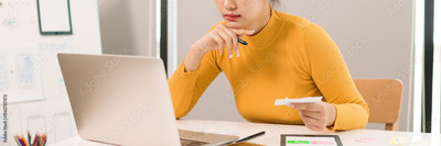 Asian Woman User Interface Designer at Desk Working on App Design Thinking About User Experience UI UX Strategy for Website and Mobile App