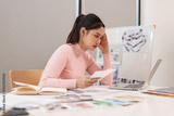 Asian Young Woman User Interface Designer Working Stressed With Laptop, Color Palette, Paper. Find Career Inspiration for UI UX Design Online Now