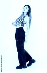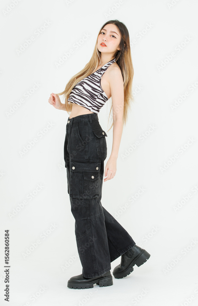 Fashion asian pretty young woman model poses confidence wear zebra print halter top, black cargo pants, chunky black boots, showcasing trendy streetwear style, creative against white background studio