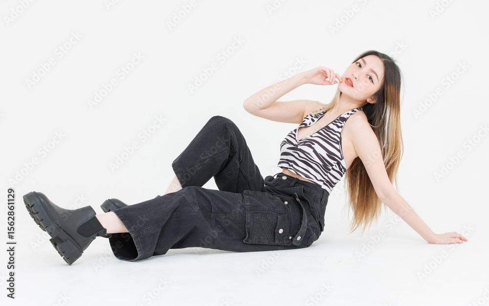 Full length of trendy fashion asian attractive pretty young woman model poses confidence wear zebra print halter top, black cargo pants, look at camera streetwear style sitting white background studio
