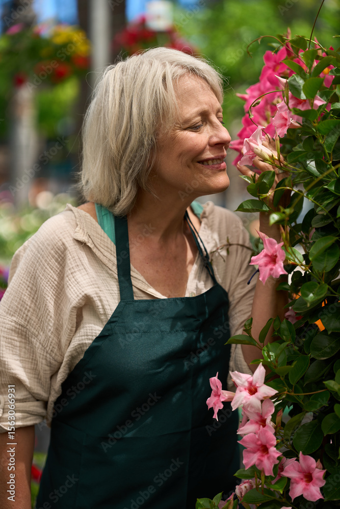 Senior woman gardener smelling dipladenia flowers in garden center