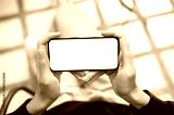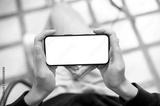 Close up hands holding white screen smartphone horizontally watching videos or playing game on bench