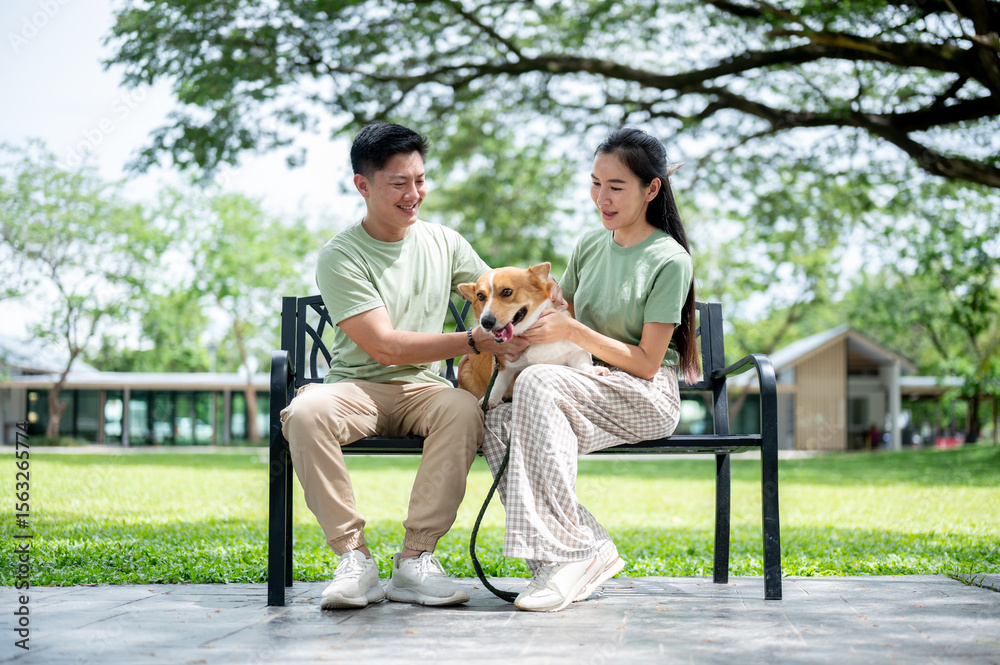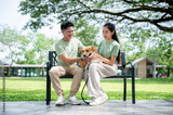 Asian man and woman holding patting corgi puppy taking a rest after walking sitting on park's bench.