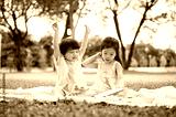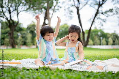 Boy raising hand holding pencil and girl looking at notebook sits on picnic mat over grass in park.