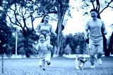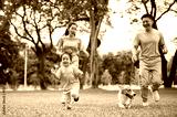 Smiling dad holding a leash on corgi puppy while walking running with mom and son on grass in park.