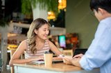 Asian woman talking to a man holding calculator while sitting at wooden table in a cafe or canteen.