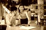 Asian woman standing and bending over wooden table looking at a man's tablet in cafe or canteen.