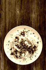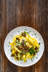 Papperdelle pasta with champignons mushrooms in cream sauce and parsley on wooden table