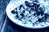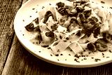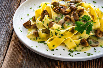 Papperdelle pasta with champignons mushrooms in cream sauce and parsley on wooden table
