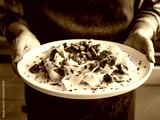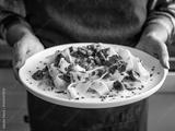 Woman holding plate with papperdelle pasta with champignons mushrooms in cream sauce and parsley