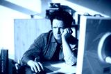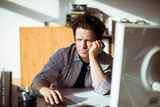 Frustrated man working at computer in home office