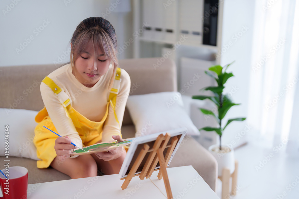 Young Asian woman is painting artwork on canvas with brush at home studio hobby relax time.