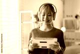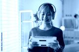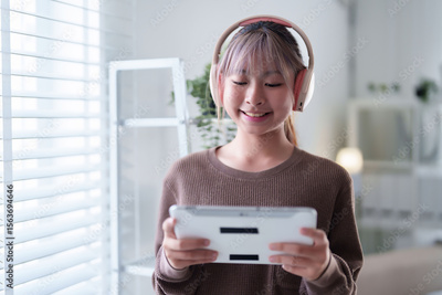 Young Asian woman enjoys entertainment using tablet with headset in a cozy room modern life with technology for digital media content