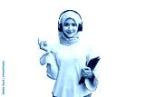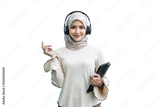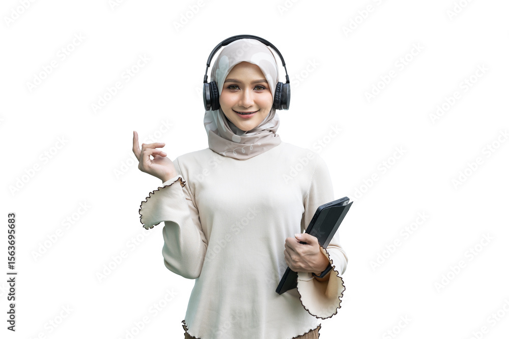 Portrait attractive muslim women hijab smile holding tablet standing on isolated white background. Clipping path.
