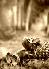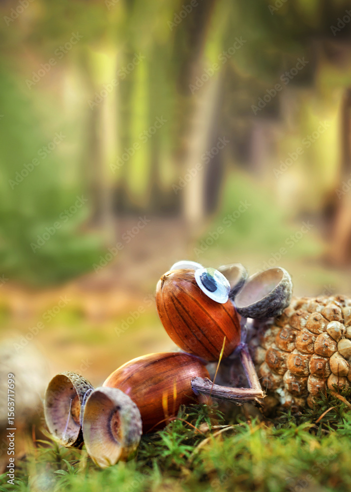 cute small acorn figure lying on moss in autumn forest on a pine zap