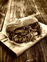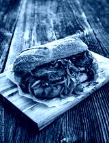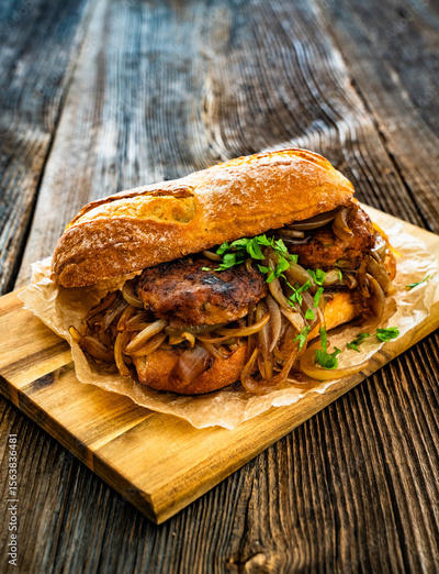 Takeaway sandwich with fried minced cutlets and caramelized onion on wooden table