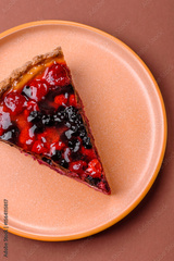 Pie, cheesecake with mascarpone, raspberries and blackberries. Cheesecake with cheese