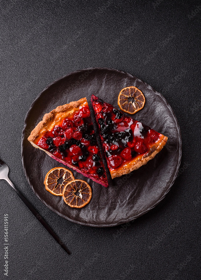 Pie, cheesecake with mascarpone, raspberries and blackberries. Cheesecake with cheese