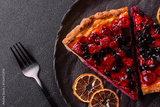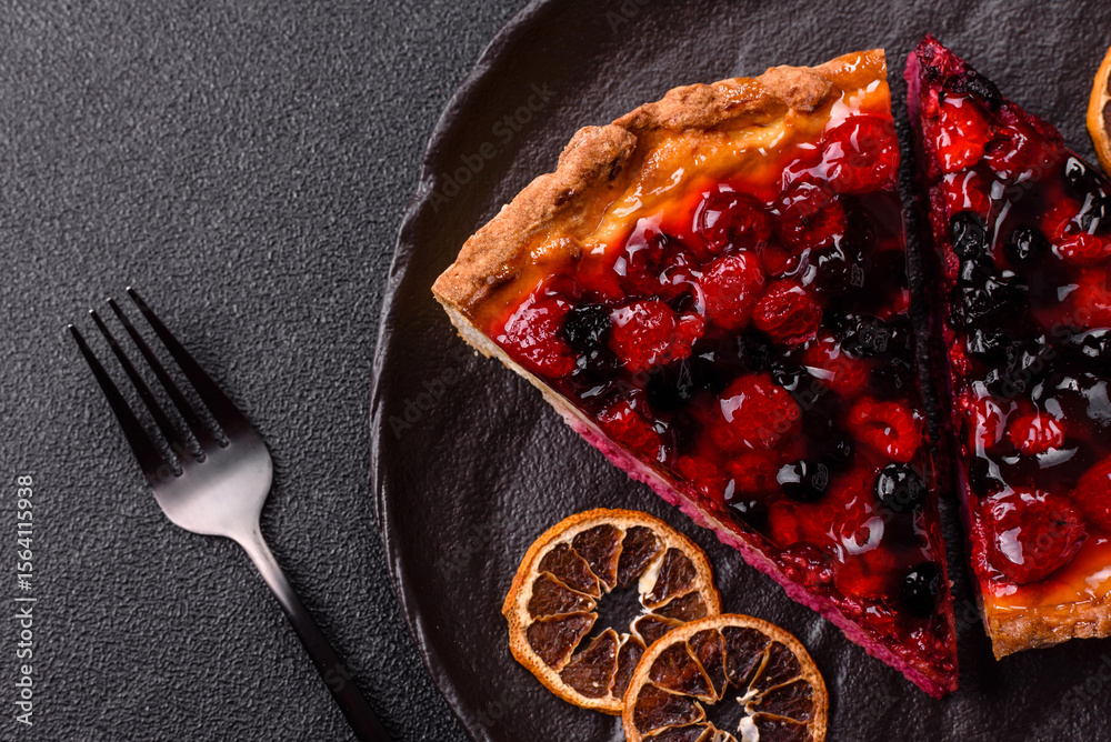 Pie, cheesecake with mascarpone, raspberries and blackberries. Cheesecake with cheese