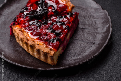 Pie, cheesecake with mascarpone, raspberries and blackberries. Cheesecake with cheese