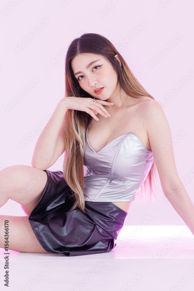 Asian pretty young woman model sitting on floor posing playfully confident under purple neon lighting wearing silver corset top black pleated leather skirt trendy streetwear creating fashion in studio