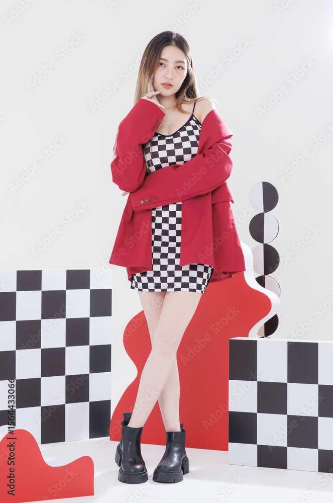Fashionable photo confident woman model asian beautiful female wearing trendy checkered mini dress bold red blazer black boots standing posing look at camera in playful studio on colorful background.
