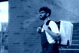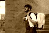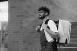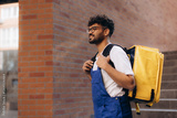 Delivery man carrying yellow thermal backpack walking near brick wall