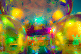A vibrant, abstract artwork featuring a close-up of a shiny, surface reflecting multicolored light. The dominant hues are red, orange, yellow, and pink, with hints of blue and green.