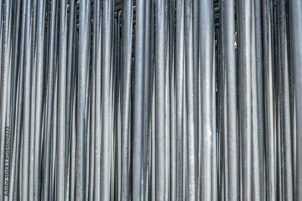 Close-up view of numerous vertically aligned, cylindrical metal pipes