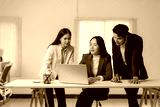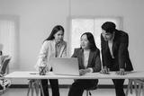 Three business professionals engage in a collaborative meeting, discussing strategies and ideas while working on a laptop in a modern office setting