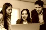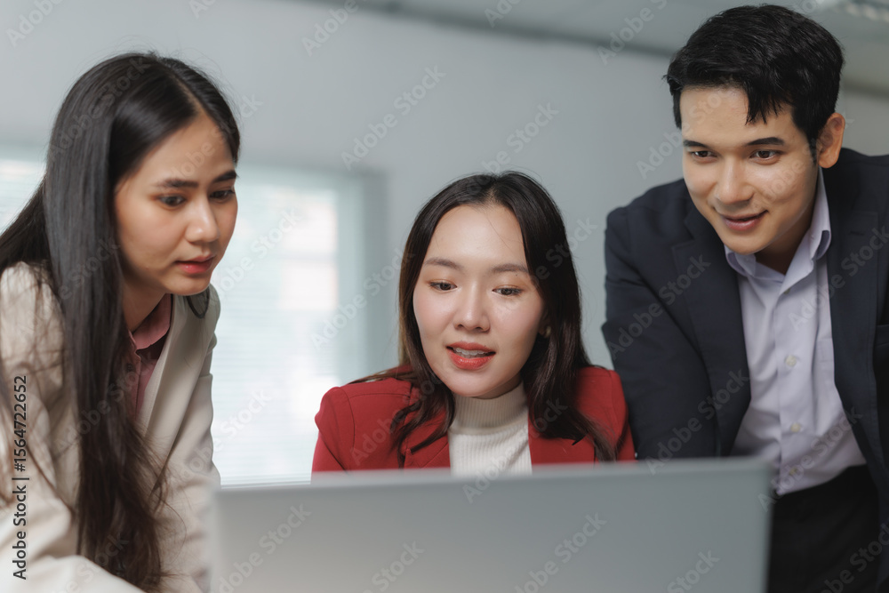 Three colleagues gather around a laptop, actively discussing and collaborating on a business project in a modern office setting