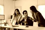 Three business professionals engaging in a serious discussion around a laptop in a modern office, focusing on collaboration and problem solving