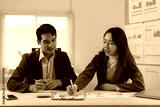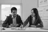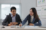 Two business professionals collaborate on financial analysis, reviewing charts and graphs in a modern office setting, focusing on data driven decisions