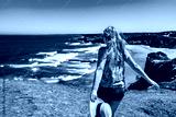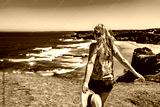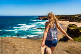Beautiful mid adult woman tourist enjoying walk on cliff overlooking Monte Clerigo beach and ocean in summertime. Algarve Portugal. Back view