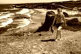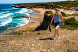 Beautiful mid adult woman tourist enjoying walk on cliff overlooking Monte Clerigo beach and ocean in summertime. Algarve Portugal. Front view