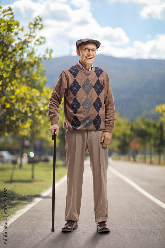 Senior man standing with a walking cane in a park