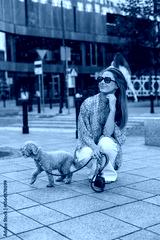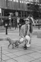 Young woman squatting on a city sidewalk with her small curly dog on a leash. She wears sunglasses and a casual outfit, enjoying a relaxed urban moment with her pet in modern surroundings.