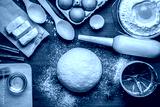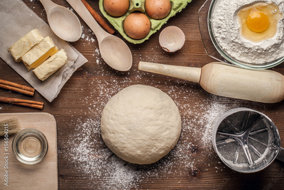 Hands working with dough preparation recipe bread, pizza, pie or samsa making ingridients, food flat lay on kitchen table background. Butter, milk, yeast, flour, eggs, sugar pastry or bakery cooking.