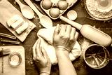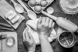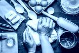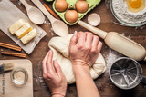 Baker knead dough bread, pizza or pie recipe ingridients with hands, food flat lay on kitchen table background. Working with butter, milk, yeast, flour, eggs, sugar pastry or bakery cooking.